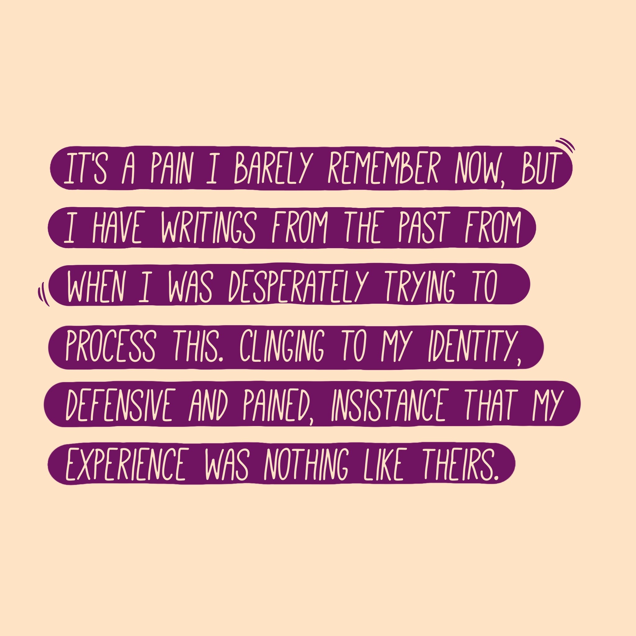 It's a pain I barely remember now, but I have writings from the past from when I was desperately trying to process this. Clinging to my identity, defensive and pained, insistance that my experience was nothing like theirs. It wasn't me, it wasn't, it wasn't, it couldn't be. So much self destructive energy, all spiraling around the idea that I might have been wrong.