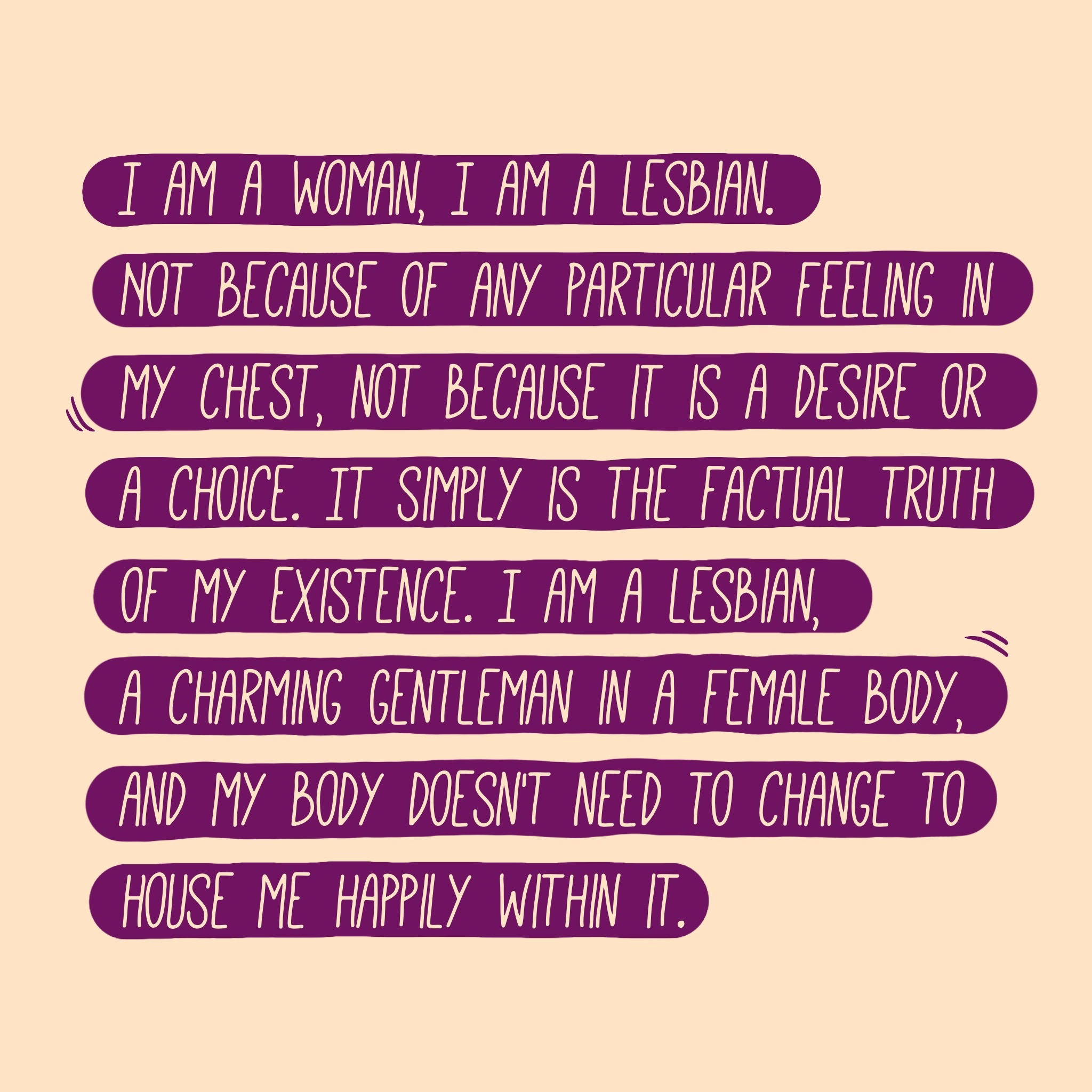 I am a woman, I am a lesbian. Not because of any particular feeling in my chest, not because it is a desire or a choice. It simply is the factual truth of my existence. I am a lesbian, a charming gentleman in a female body, and my body doesn't need to change to house me happily within it.